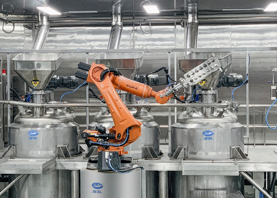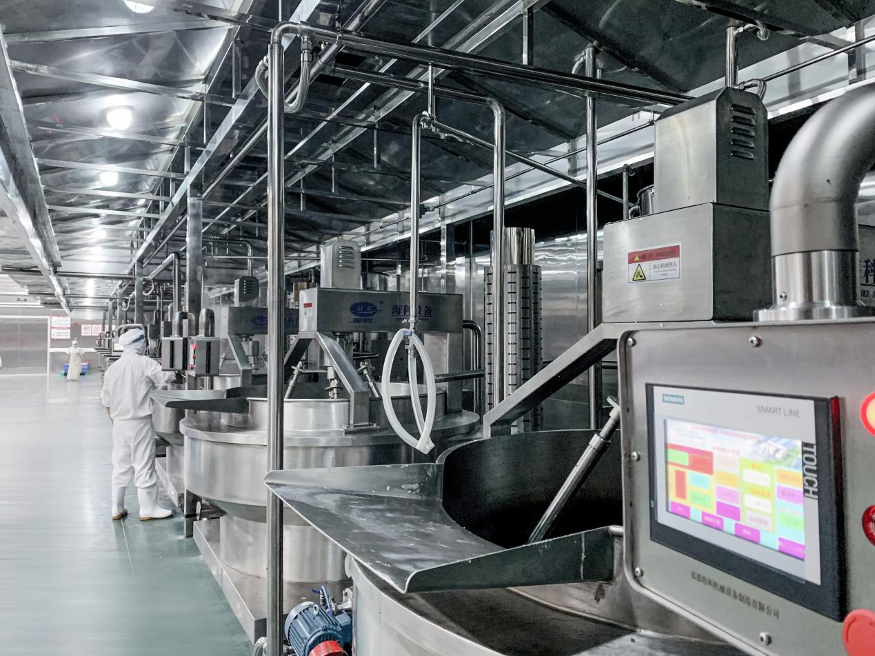 行業(yè)內(nèi)首家采用反應(yīng)釜和機(jī)器人進(jìn)行火鍋底料炒制,車(chē)間配備12臺(tái)反應(yīng)釜,4臺(tái)機(jī)械臂炒料機(jī)器人及4套智能控制系統(tǒng)。單釜單日產(chǎn)量可達(dá)8噸,全年總體產(chǎn)量可達(dá)2.8萬(wàn)噸,在提升產(chǎn)能和穩(wěn)定產(chǎn)品品質(zhì)的同時(shí),還能通過(guò)蒸汽循環(huán)和釜內(nèi)120度的固定溫控,使決定火鍋底料香氣的主要成分“烯類(lèi)成分”較傳統(tǒng)炒制工藝高出26.9%。