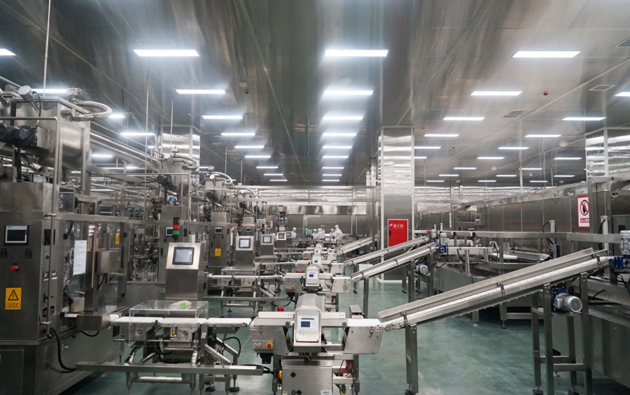 自動(dòng)化包裝分為內(nèi)包裝和外包裝兩個(gè)工序,整體工序比傳統(tǒng)包裝工序提高50%。共配備16臺(tái)包裝機(jī),可灌裝油料混裝類(lèi)、流通線類(lèi)、手工方塊類(lèi)產(chǎn)品。每臺(tái)機(jī)器配置重檢機(jī)、金檢機(jī)對(duì)產(chǎn)品重量和金屬異物進(jìn)行復(fù)檢,減少異物混入的風(fēng)險(xiǎn),提升產(chǎn)品品質(zhì)。外包裝配備3臺(tái)套袋機(jī)對(duì)流通線產(chǎn)品的進(jìn)行外袋包裝,配備8臺(tái)給袋式包裝機(jī)對(duì)600g-1kg的產(chǎn)品進(jìn)行包裝,日包裝量達(dá)100噸。