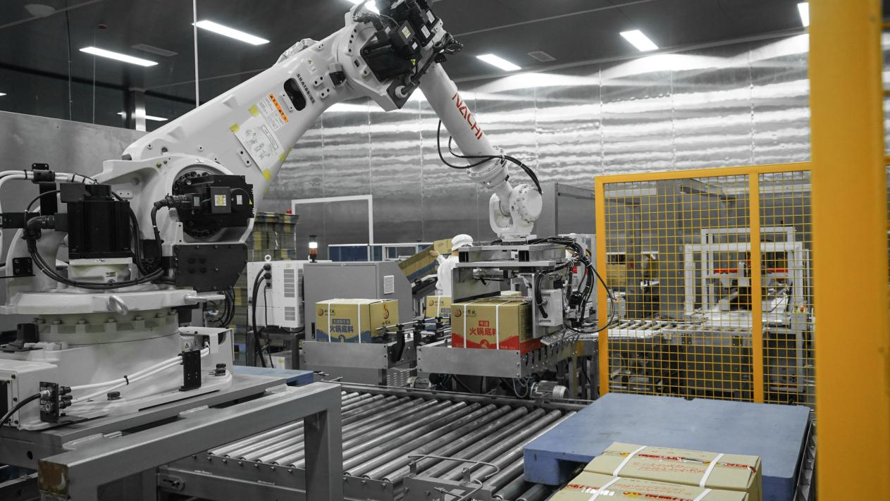 采用2臺(tái)裝箱機(jī)器人對(duì)產(chǎn)品進(jìn)行自動(dòng)化裝箱封箱,無(wú)人為引入異物風(fēng)險(xiǎn),大大提升每日產(chǎn)能和效率。無(wú)論是底料、蘸料、還是川調(diào)產(chǎn)品,全面覆蓋終端場(chǎng)景所應(yīng)用的美食產(chǎn)品,都將通過(guò)這一環(huán)節(jié)實(shí)現(xiàn)最終成品的對(duì)外輸出。