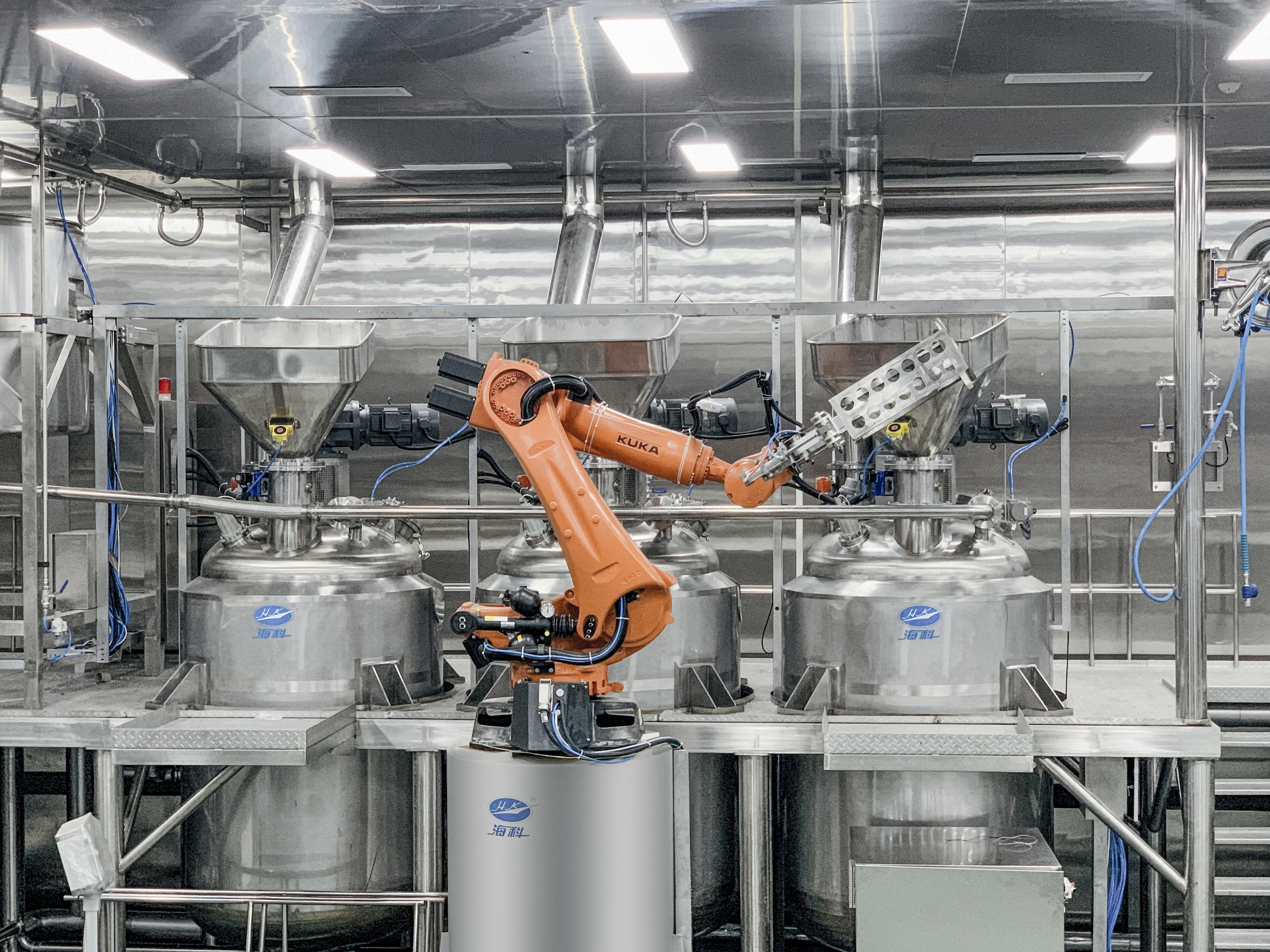 2019年建成的眉山智慧工廠火鍋底料車間,大膽采用反應(yīng)釜機(jī)器人炒料,減少人工對產(chǎn)品在生產(chǎn)過程中口味及品質(zhì)的影響,同時(shí)也減少異物引入風(fēng)險(xiǎn)。